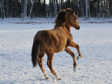 Neue Bilder von Marias Perusso. Zingaros Sohn genießt seinen ersten Schnee und tobt selbstbewußt über die verschneiten Weiden.